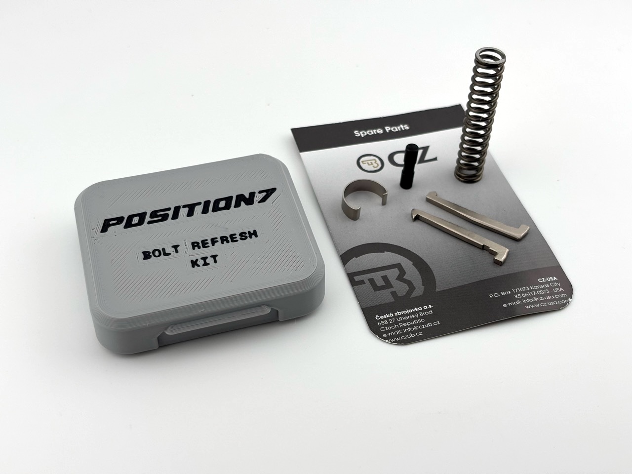 This kit is designed to stay in your range bag, as a little box of spares for when you need them. It is built from OEM CZ parts, straight from the CZ factory. They come in a small 3d printed box for easy storage and transport. These parts were specifically chosen because they are wear parts that are easily damaged (or lost during disassembly) :-).